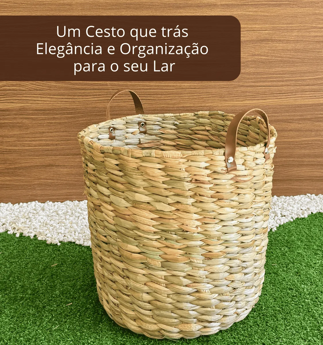 Cesto Organizador Cachepô de Palha de Taboa com alça de Couro Cesto versátil e funcional, ideal para manter sua casa sempre organizada e charmosa. Pode ser usado para guardar mantas, cobertores, toalhas, brinquedos ou até como cachepot para plantas, adicionando um toque natural e elegante à decoração de qualquer ambiente.