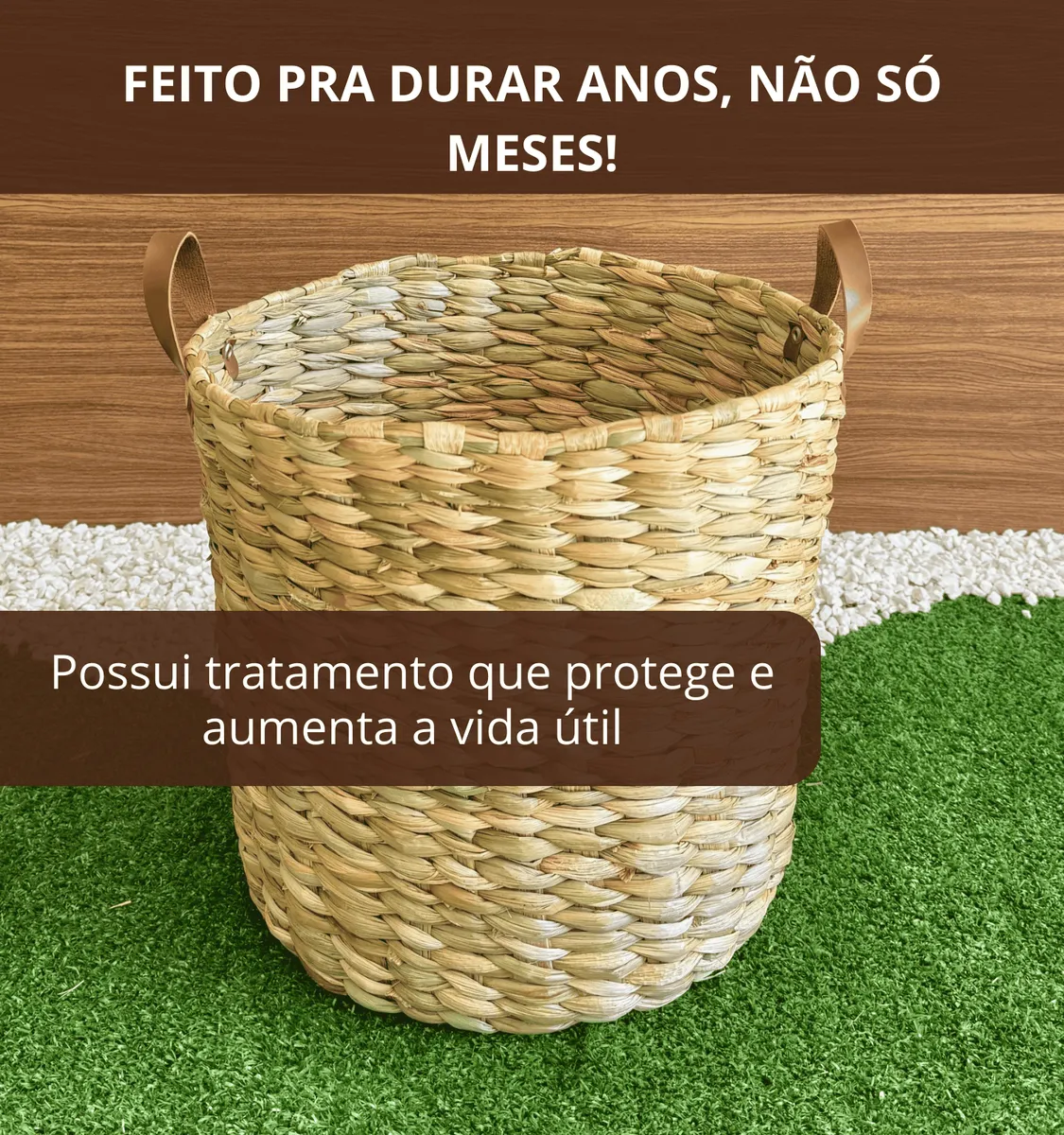 Composição: Palha de Taboa Natural -Material da Alça: Couro. Medidas: 32cm diâmetro 30cm altura Garantia de fábrica: 30 dias