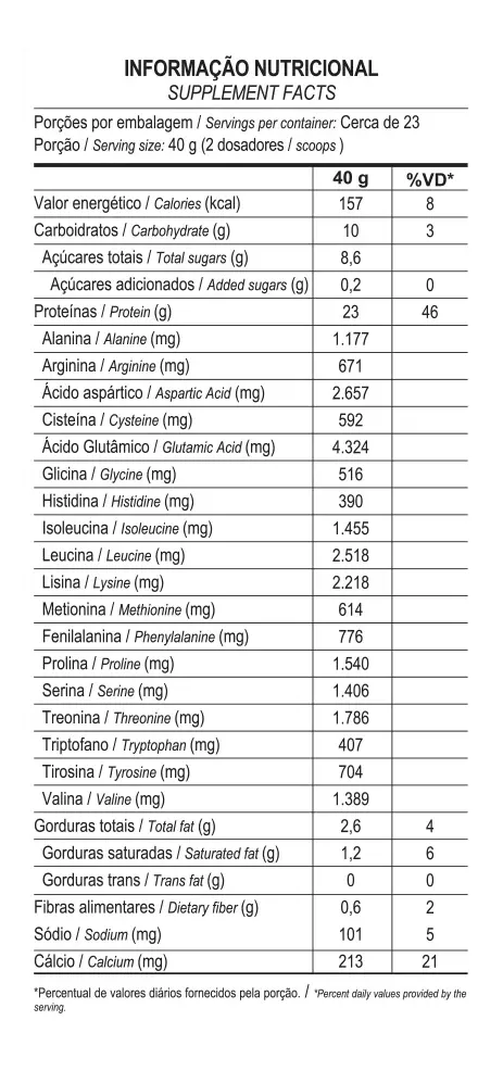 Ideal para consumo próximo ou após os treinos, fornece 23g de proteínas por porção, que auxiliam na formação dos músculos e ossos.